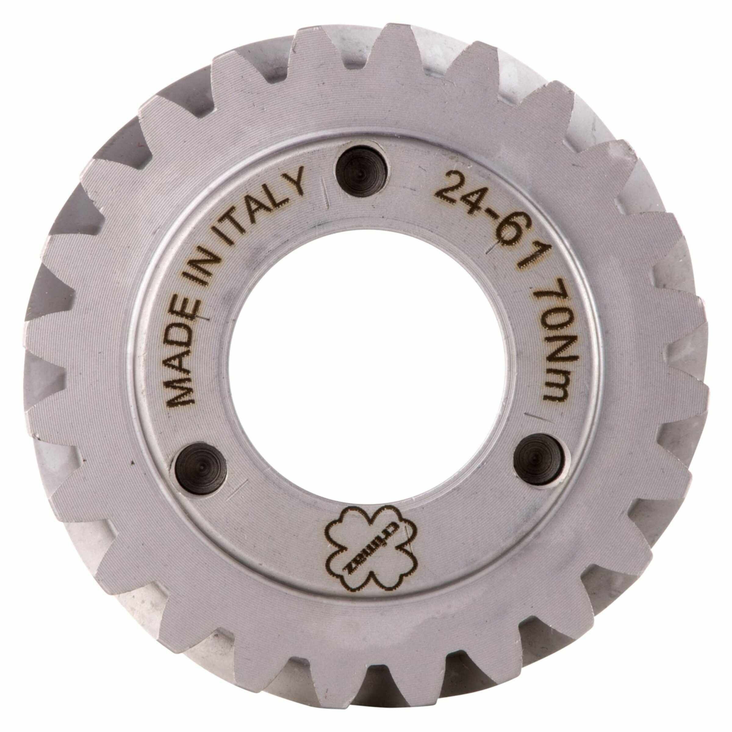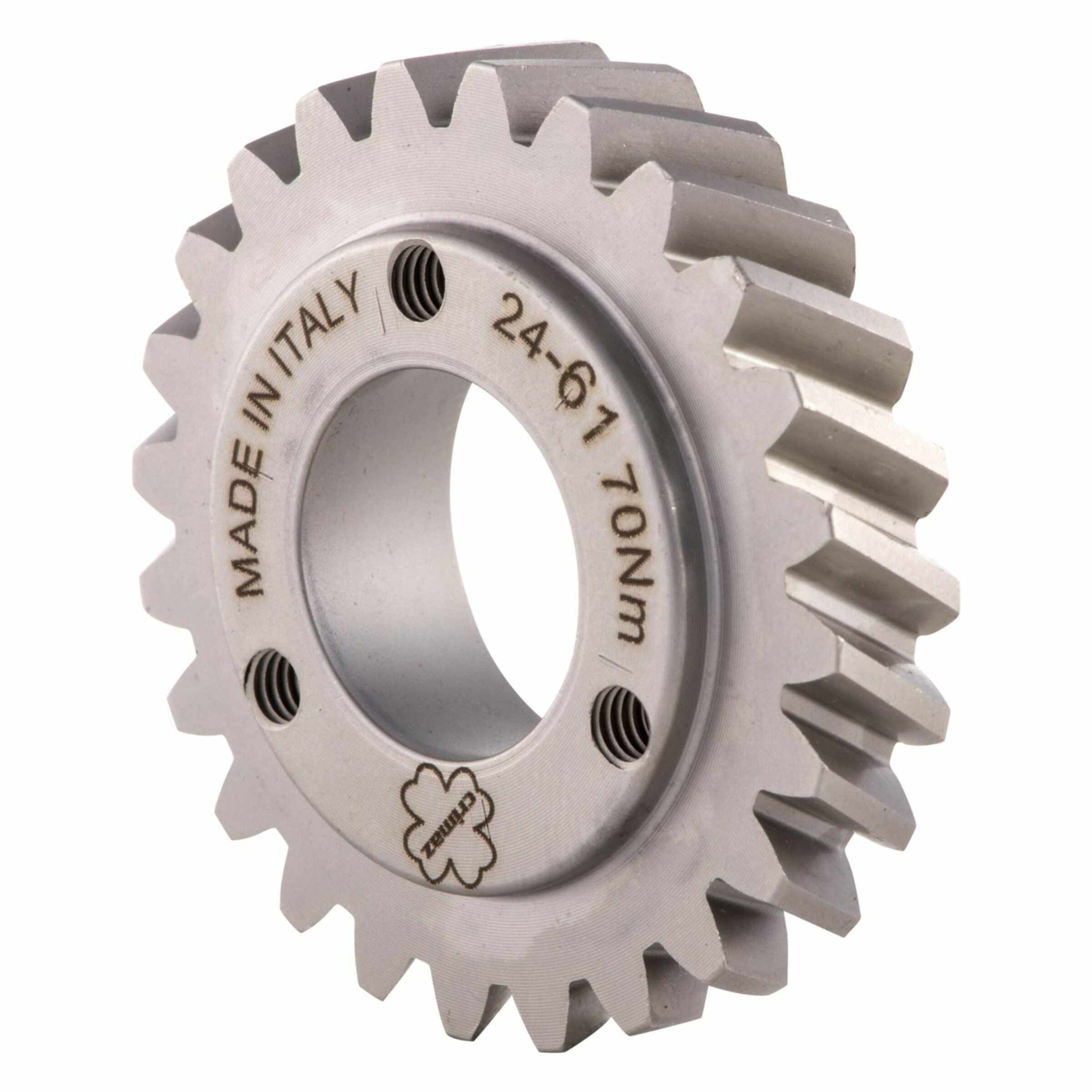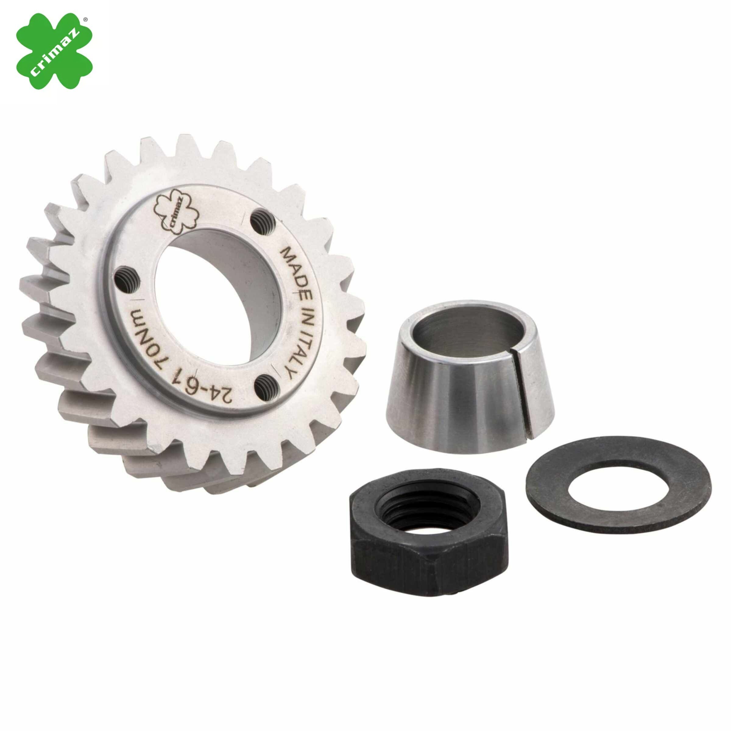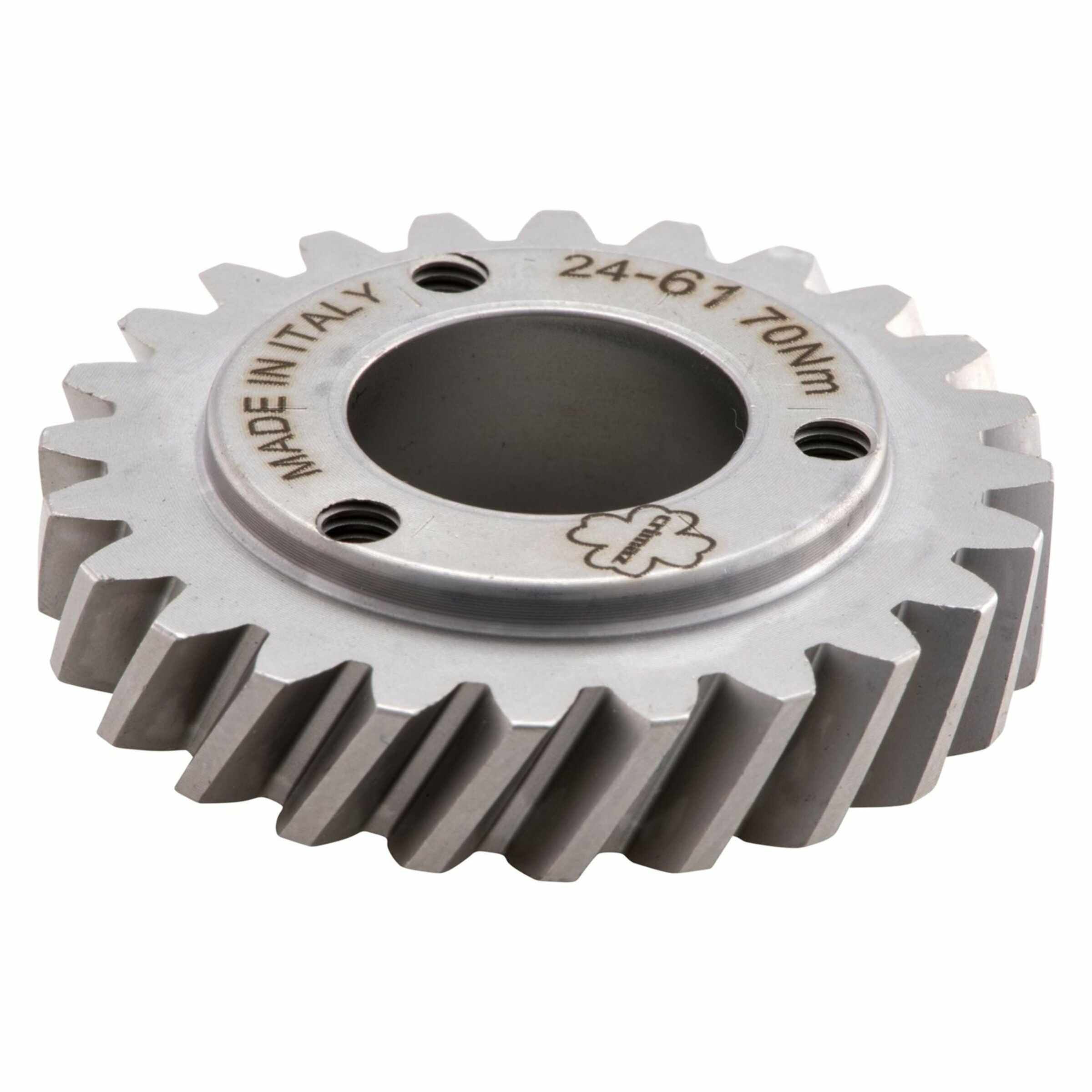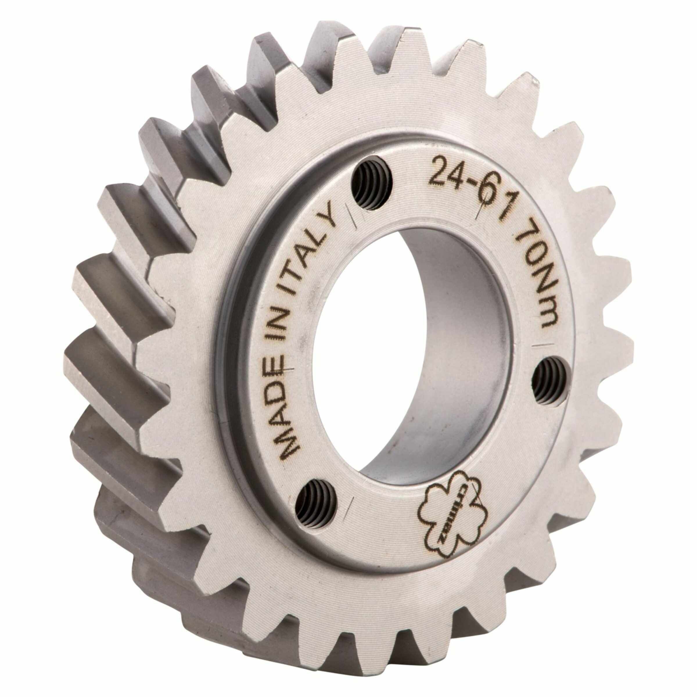 a sostituzione pignone per campana frizione primaria coppia trasmissione 24/61 - 24 61 - 24-61 denti elicoidali elicoidale. Con questo pignone diventa 24/61 - 24 61 - 24-61 denti. Diametro ingranaggio 44,5 mm fornito con dado , rondella e cono