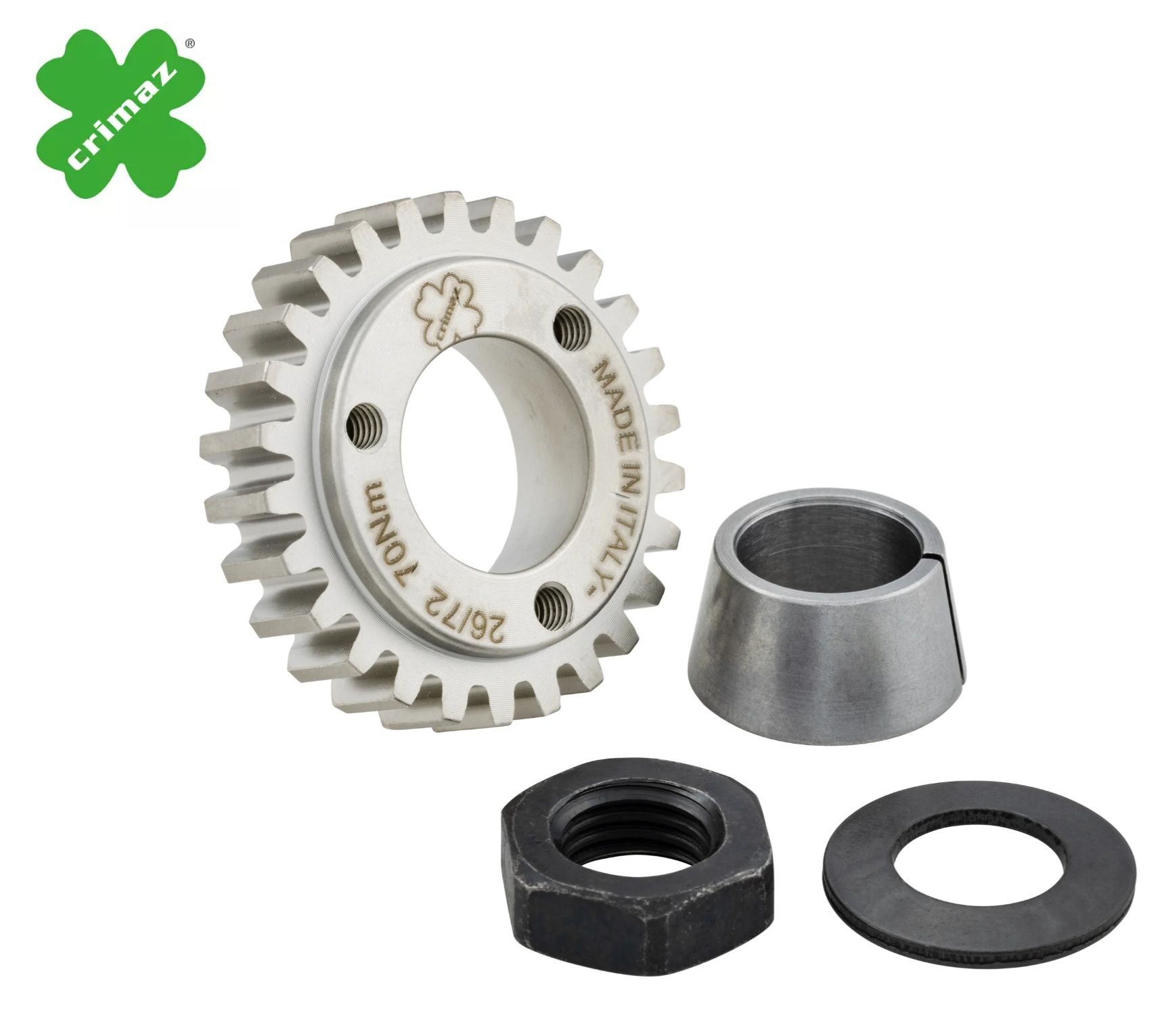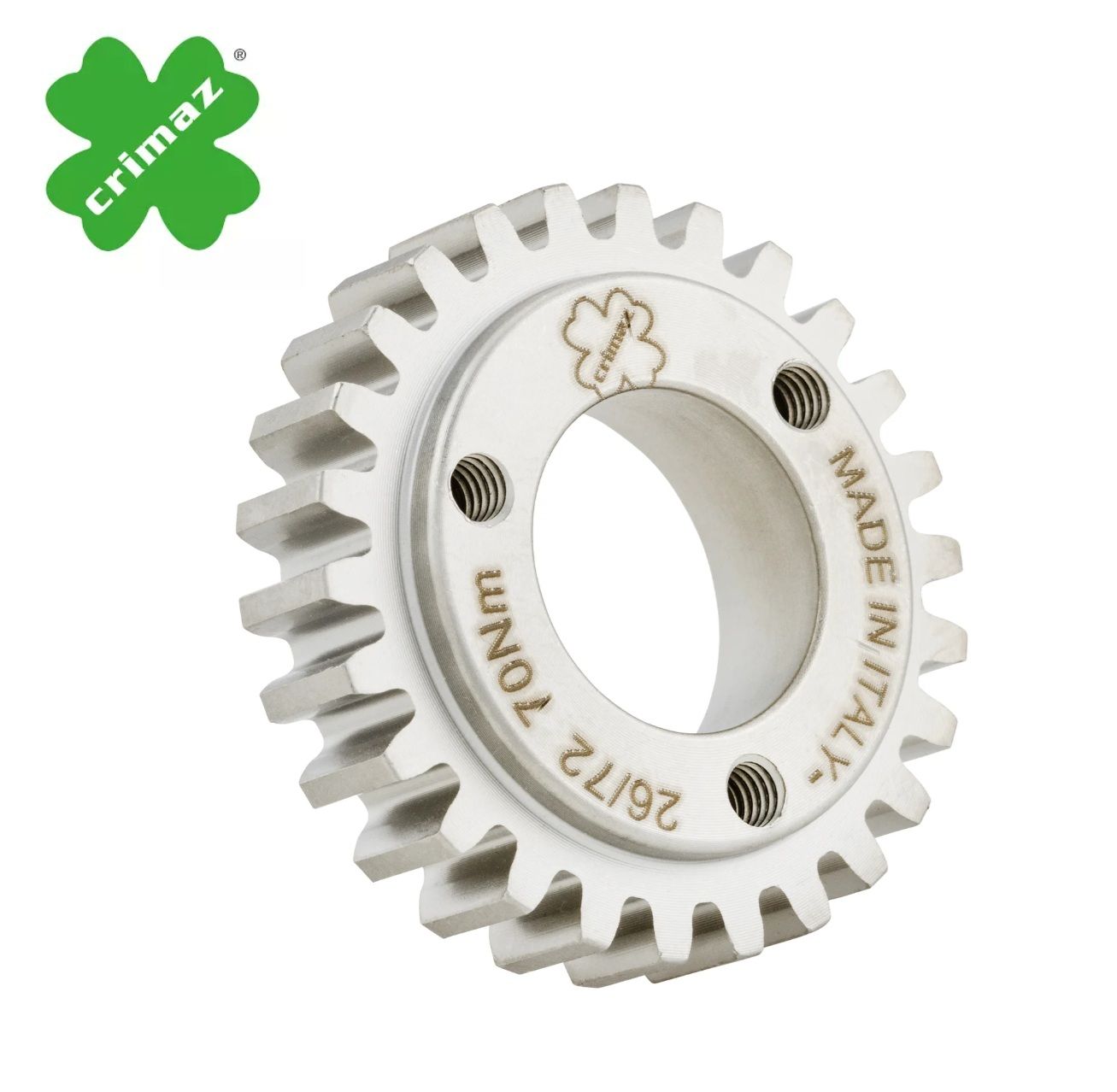 a sostituzione pignone per campana frizione primaria coppia trasmissione 24/72 - 24 72 - 24-72 denti dritti. Con questo pignone diventa 26/72 - 26 72 - 26-72 denti. Diametro ingranaggio 39,8 mm fornito con dado , rondella e cono