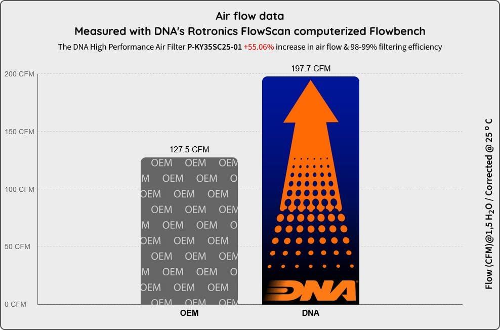 Quando l’aria passa attraverso il filtro DNA® quest’ultimo ne regolerà il flusso riducendo la turbolenza e inviando aria continua, pura e pulita verso l’aspirazione del motore, incrementando la coppia e la potenza. Oltre a un’elevata quantità della portata d’aria, è molto importante che il flusso sia regolare ed omogeneo. Ciò spiega perché vediamo una riduzione della potenza di uscita quando testiamo col banco prova una moto o un’auto “senza” filtro: la circolazione dell’aria nella scatola del filtro è disturbata e il risultato è turbolenza e bassa potenza in uscita. Le elevate prestazioni si ottengono con la maggiore corrente d’aria regolare e pulita che entra nel motore.