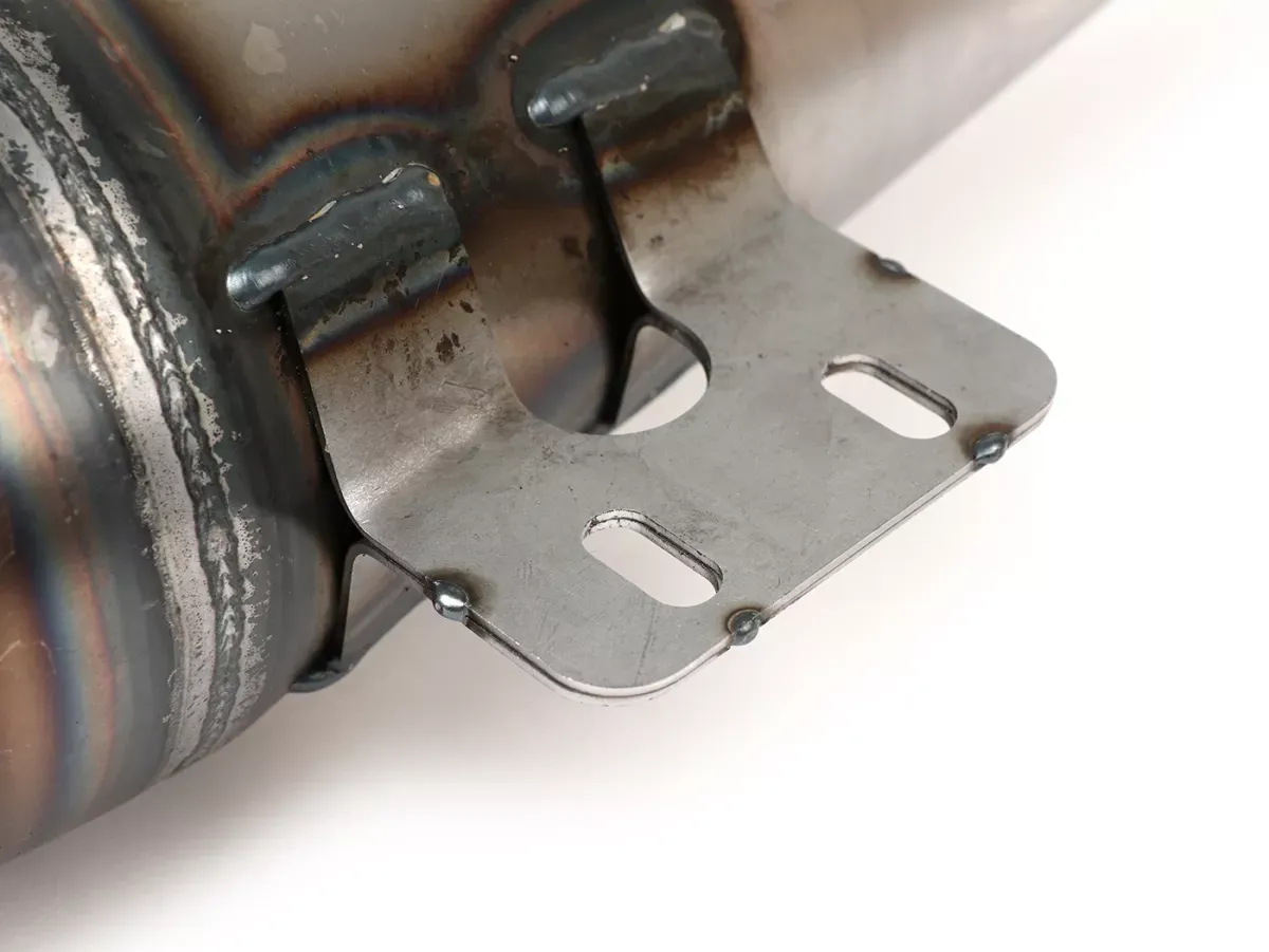 La flangia con asole offre ulteriori possibilità di regolazione per adattare perfettamente lo scarico al telaio di riferimento. La piastra a tre fori è stata realizzata specificamente per i modelli EGIG205/210/220, ma con piccole modifiche può essere montata anche sull’M200. Il terzo foro centrale non è indispensabile e, se necessario, può essere rimosso.